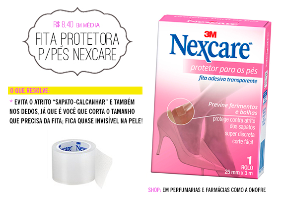 Apaixonada por esse produto! Mil vezes mais eficiente que band-aid pra a função “sapato assassino”, essa fita da Nexcare protege bastante o pé e, não me perguntem como, adere tanto quanto é fácil de tirar depois. Uso muito no calcanhar quando sei que vou andar horrores...